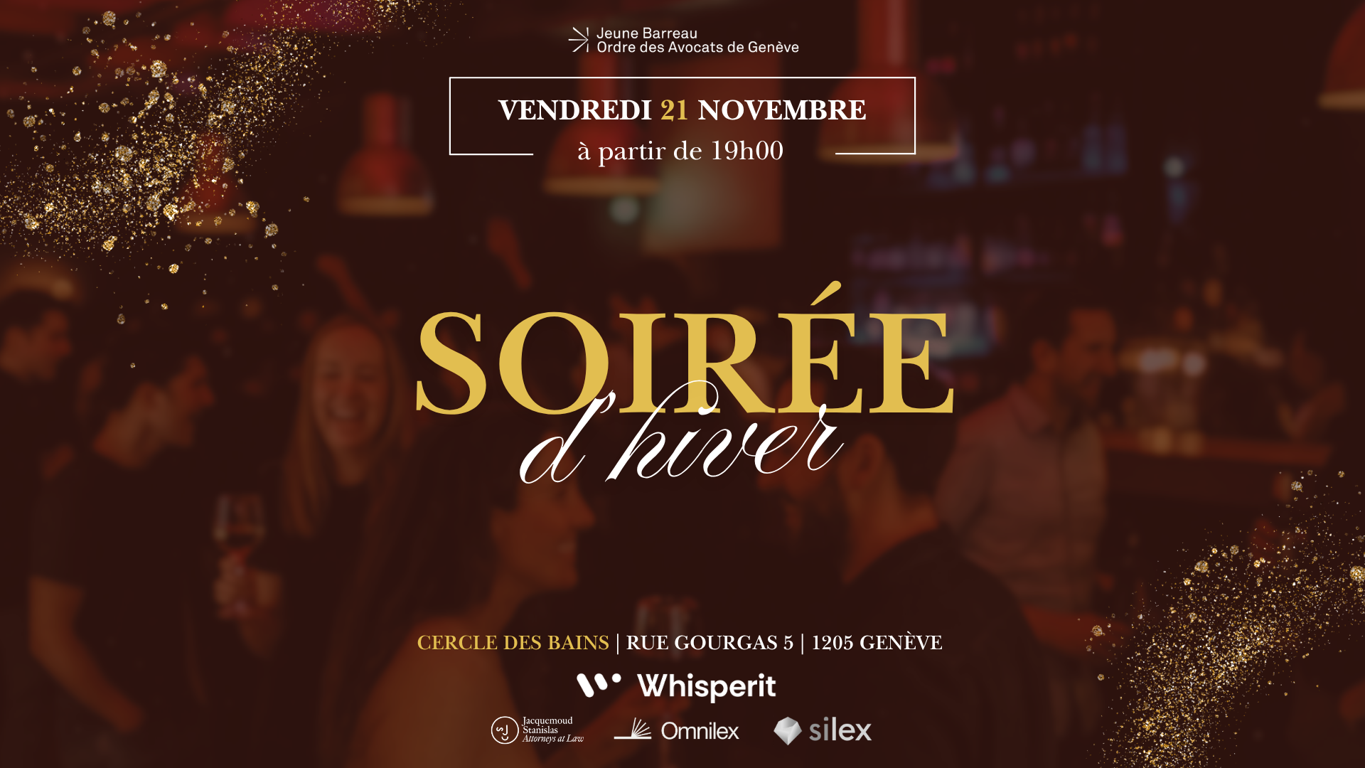 Le Comité du Jeune Barreau a le plaisir de vous convier à sa traditionnelle Soirée d'hiver le 21 novembre prochain, qui aura lieu au Cercle des Bains.